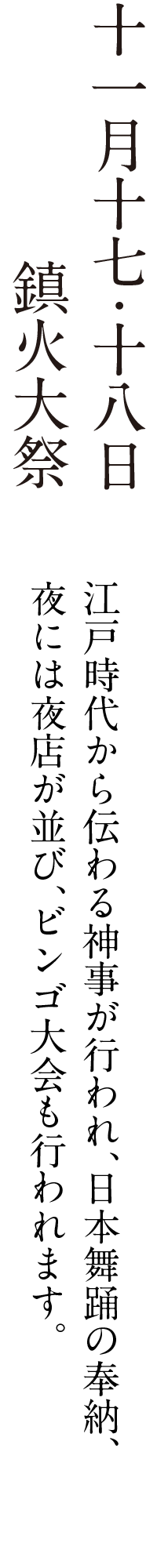 火の神を祀る秋葉神社の鎮火祭は、毎年十一月十七・十八日に行われる最も重要なおまつりです。鎮火祭は、古代・中世より宮中において行われていた祭りであり、宮城(きゅうじよう)の防火守護が目的であったといわれております。延喜式巻八祝詞集【延喜五年(905)編纂された古代の法律の細則を集めたもので、延喜式と呼ばれ全五十巻】の中にも収められている重要な祭典です。