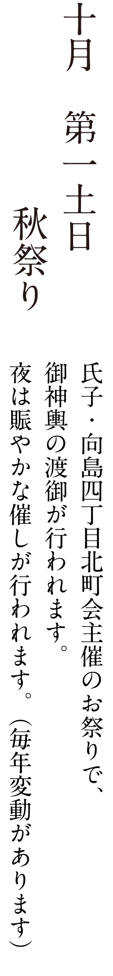 当崇敬会は、主に地元向島4丁目北町会を母体とする崇敬者で構成され、崇敬神社秋葉大神をお守りしています。
